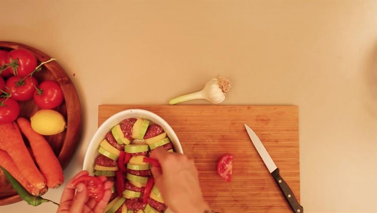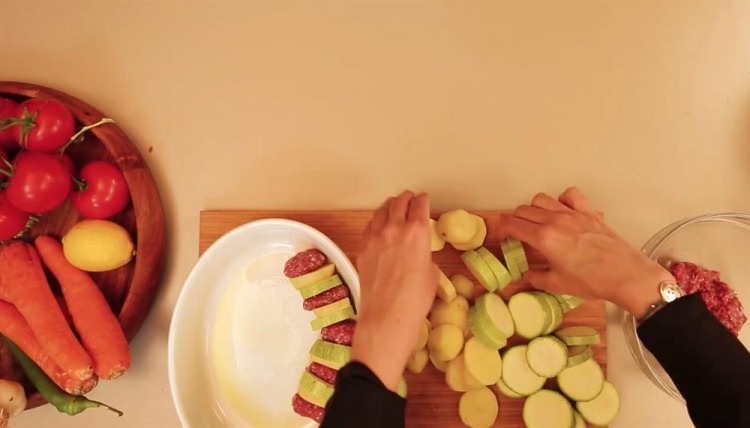 Fırın kabını yağlayalım. Ceviz büyüklüğünde yuvarladığımız köfteleri ve doğradığımız sebzeleri arka arkaya dizelim.