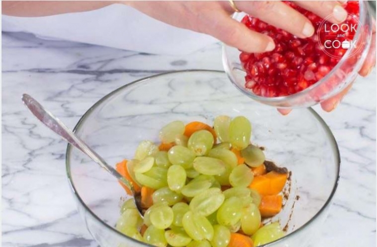 Geniş bir kaseye patatesleri alarak doğradığımız üzüm, nar ve sosu ekleyerek karıştıralım. Taze kişniş ile süsleyerek servis edelim.