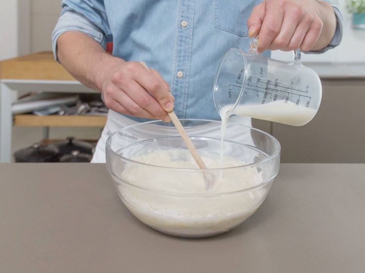 Karabuğday unu, süt, yumurtayı ekleyip karıştıralım. Tuz ve karabiber serpip karıştıralım.