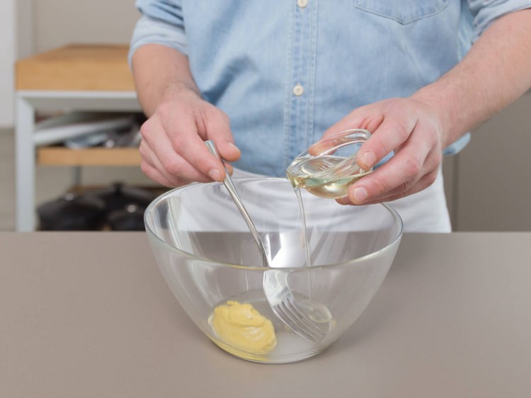 Bir kapta yağ, hardal, sirke, su ve şekeri karıştıralım.