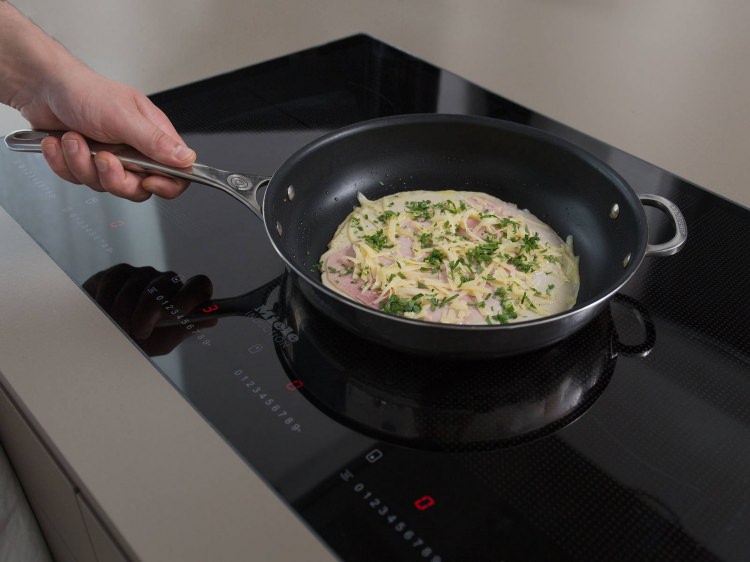 Tavaya yağ koyalım ve krep harcından bir kepçe ekleyelim. Üzerine doğranmış jambon, maydanoz, peynir serpip pişirelim. Krebi rulo yapıp servis edelim.
