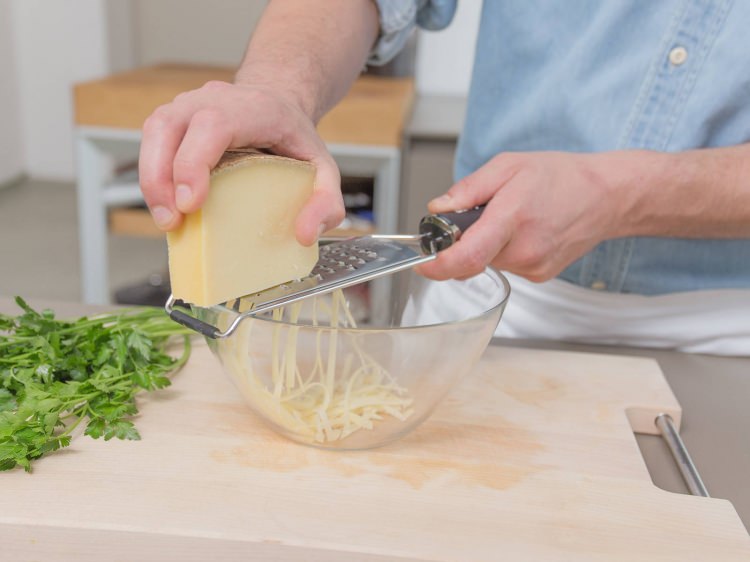 Peyniri rendeleyelim. Maydanoz ve marulu doğrayalım.