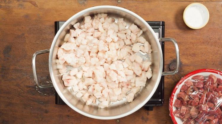 Geniş ve büyük bir tencerenin içine kurutulan kuyruk yağını küp şeklinde doğrayın ve harlı ateşte kavurun ve tuz ekleyin.