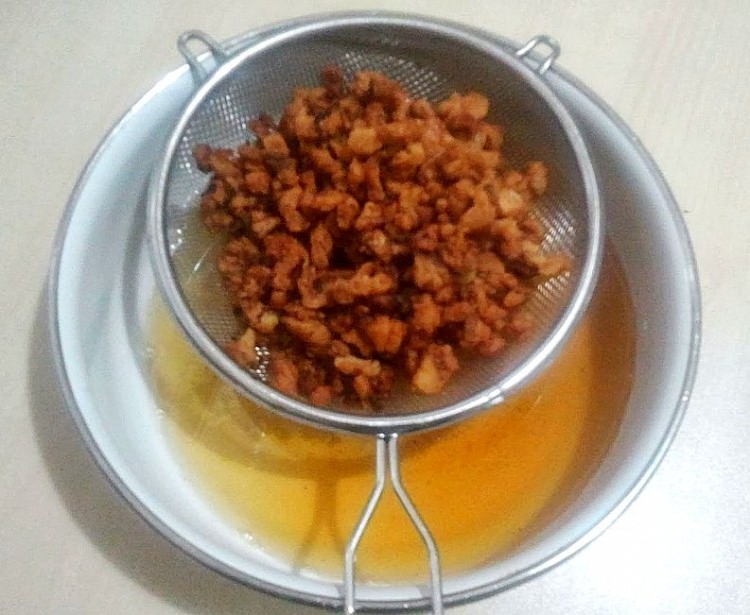 Yağ köpürmeye başlayınca ocağın altını kısın. Yağın içindeki kıkırdaklar altın sarısı olunca tencereyi ocaktan alın ve 5 dk soğumaya bırakın.