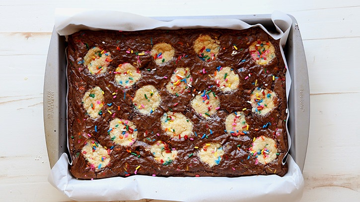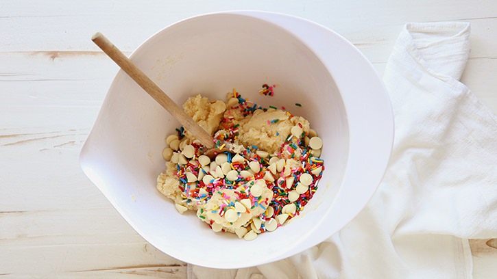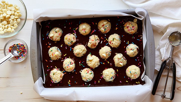 Kurabiye katmanı için şeker ve tereyağını yoğuralım. İçine unu ekleyelim. Bir sürede bu şekilde yoğuralım. Daha sonra damla çikolataları ve renkli şekerleri ekleyelim ve iyice karıştıralım.