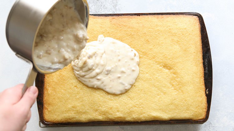 Hazırladığımız kek karışımını 120 derecede 30 dakika pişirelim. Daha sonra üzerine hazırladığımız kremayı dökelim.