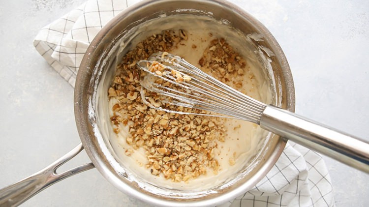 Kremalı katmanı hazırlamak için, kremayı, sütü, toz şekeri çırpalım. Son olarak içine cevizleri koyalım.