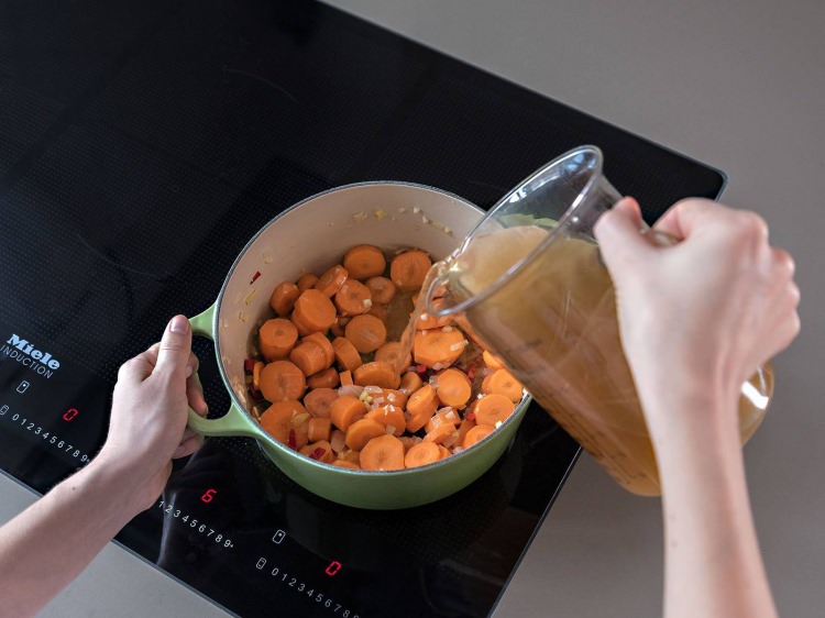 Havuç ve sebze suyunu ekleyip 20 dk yumuşayana kadar pişirelim.