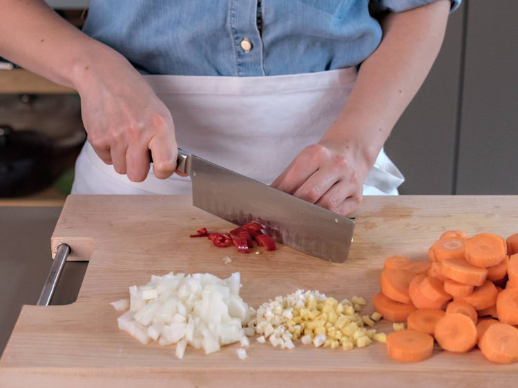 Havuç, soğan, sarımsak, zencefil ve biberi doğrayalım.