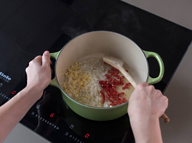 Büyük bir tencerede hindistan cevizi yağını ısıtıp, soğan, sarımsak, zencefil ve biberi soteleyelim.