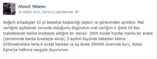 Yıldırım Facebook hesabından yaptığı açıklamada şunları belirti;" Değerli arkadaşlar 10 yıl belediye başkanlığı yaptım ve görevimden ayrıldım. Mal varlığımı açıklamak zorunda olduğumu düşündüm. Mal varlığım; Şehit Ali Bey Mahallesinde banka kredisiyle aldığım bir daire, 2005 model hundai marka bir araba (zamanında banka kredisiyle alındı), Aydınlı köyünde babadan kalma 6350 metrekare tarla. Ziraat bankası ve eş dosta 35000 TL civarında borç. Bütün Eşme'ye halkıma saygıyla duyururum." Şeklinde açıklamada bulundu.