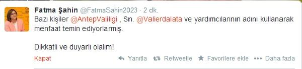 Büyükşehir Belediye Başkanı AK Parti'li Fatma Şahin, sosyal medya sitesi Twitter'dan, kentte vali ve yardımcılarının adını kullanarak menfaat temin edenlerin bulunduğunu ve dikkatli olunması gerektiği uyarısında bulundu.